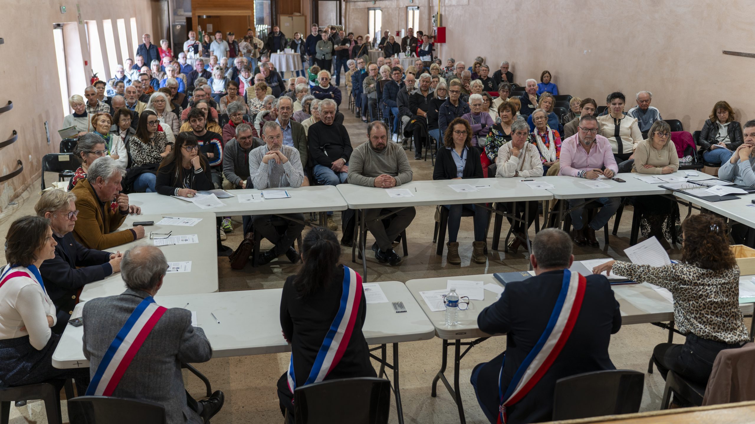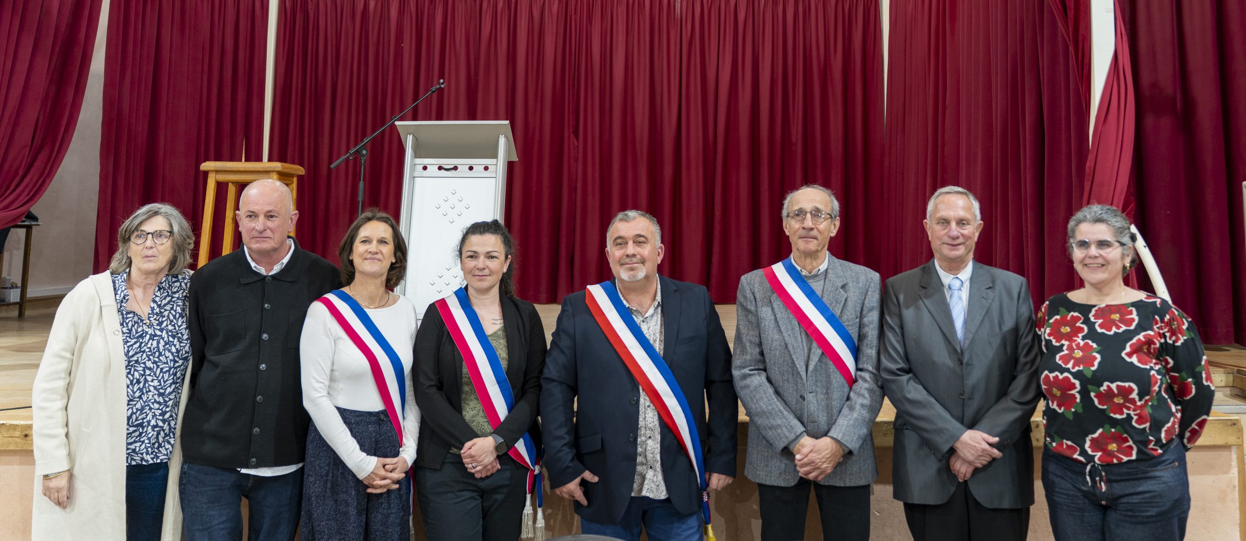 Les nouveaux élus se rassemblaient sur la scène de la salle Jean Moulin, tandis que M. Lionel Gayssot, maire sortant, les appelait dans l’ordre du tableau et les invitait à prendre place à la table du conseil.
